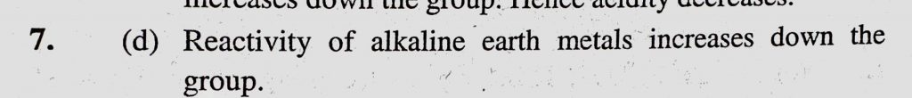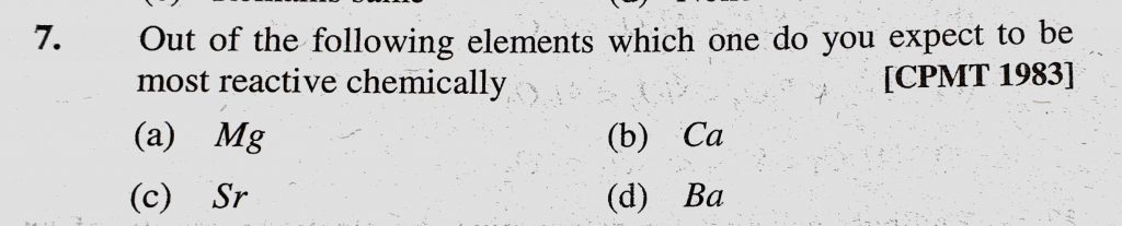 Out of the following elements which one do you except to be most reactive chemically (a) Mg (b) Ca (c) Sr (d) Ba Out of the following elements which one do you except to be most reactive chemically (a) Mg (b) Ca (c) Sr (d) Ba November 10, 2020 Category: Uncategorised (JEE Advanced Physics by BM Sharma + GMP Solutions) , Facebook Messenger WhatsApp Share this:TwitterFacebook Related