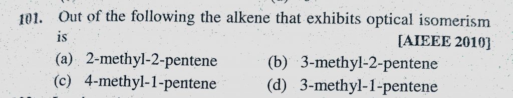 Out of the following the alkene that exhibits optical isomerism is (a) 2-methyl-2-pentene (b) 3-methyl-2-pentene Out of the following the alkene that exhibits optical isomerism is (a) 2-methyl-2-pentene (b) 3-methyl-2-pentene December 10, 2020 Category: Uncategorised (JEE Advanced Physics by BM Sharma + GMP Solutions) , Facebook Messenger WhatsApp Share this:TwitterFacebook Related