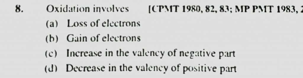 Oxidation involves (a) Loss of electrons (b) gain of electrons (c) increse in the valency of negative part (d) decrease in the valeny of positive part Oxidation involves (a) Loss of electrons (b) gain of electrons (c) increse in the valency of negative part (d) decrease in the valeny of positive part November 23, 2020 Category: Uncategorised (JEE Advanced Physics by BM Sharma + GMP Solutions) , Facebook Messenger WhatsApp Share this:TwitterFacebook Related
