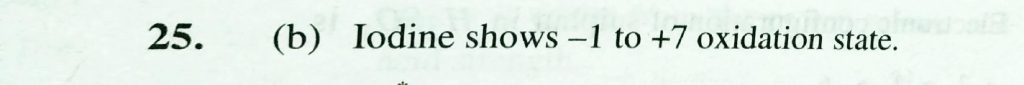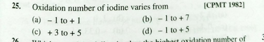Oxidation number of iodine varies from (a) -1 to +1 (b) -1 to +7 (c) +3 to +5 (d) -1 to +5 Oxidation number of iodine varies from (a) -1 to +1 (b) -1 to +7 (c) +3 to +5 (d) -1 to +5 November 23, 2020 Category: Uncategorised (JEE Advanced Physics by BM Sharma + GMP Solutions) , Facebook Messenger WhatsApp Share this:TwitterFacebook Related