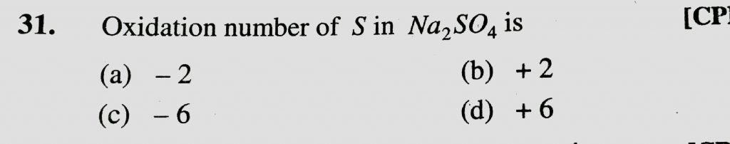 Oxidation number of S in Na2SO4 is (a) -2 (b) +2 (c) -6 (d) +6 Oxidation number of S in Na2SO4 is (a) -2 (b) +2 (c) -6 (d) +6 November 24, 2020 Category: Uncategorised (JEE Advanced Physics by BM Sharma + GMP Solutions) , Facebook Messenger WhatsApp Share this:TwitterFacebook Related