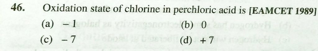Oxidation state of chlorine in perchloric acid is (a) -1 (b) 0 (c) -7 (d) +7 Oxidation state of chlorine in perchloric acid is (a) -1 (b) 0 (c) -7 (d) +7 November 24, 2020 Category: Uncategorised (JEE Advanced Physics by BM Sharma + GMP Solutions) , Facebook Messenger WhatsApp Share this:TwitterFacebook Related