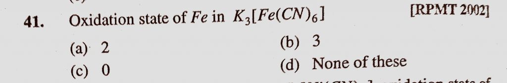 Oxidation state of Fe in K3(Fe(CN)6) (a) 2 (b) 3 (c) 0 (d) None of these Oxidation state of Fe in K3(Fe(CN)6) (a) 2 (b) 3 (c) 0 (d) None of these December 4, 2020 Category: Uncategorised (JEE Advanced Physics by BM Sharma + GMP Solutions) , Facebook Messenger WhatsApp Share this:TwitterFacebook Related