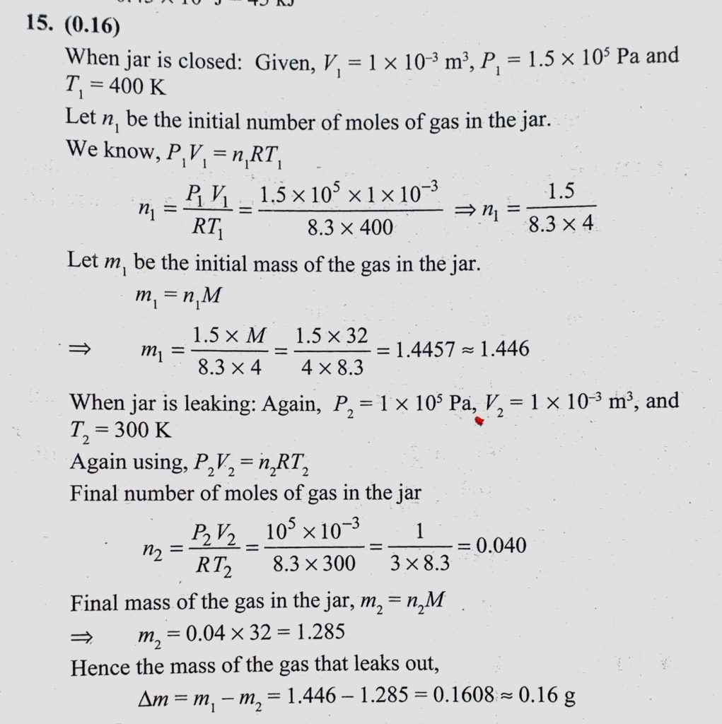 Oxygen is filled in a closed metal jar of volume 1.0 * 10^-3 m^3 at a pressure of 1.5 * 10^5 Pa and temperature 400 K. The jar has a small leak in it. The atmospheric pressure Oxygen is filled in a closed metal jar of volume 1.0 * 10^-3 m^3 at a pressure of 1.5 * 10^5 Pa and temperature 400 K. The jar has a small leak in it. The atmospheric pressure October 28, 2020 Category: Uncategorised (JEE Advanced Physics by BM Sharma + GMP Solutions) , Facebook Messenger WhatsApp Share this:TwitterFacebook Related