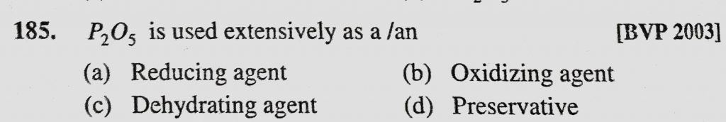 P2O5 is used extensively as a/an (a) Reducing agent (b) Oxidizing agent (c) Dehydrating agent (d) Preservative P2O5 is used extensively as a/an (a) Reducing agent (b) Oxidizing agent (c) Dehydrating agent (d) Preservative November 23, 2020 Category: Uncategorised (JEE Advanced Physics by BM Sharma + GMP Solutions) , Facebook Messenger WhatsApp Share this:TwitterFacebook Related