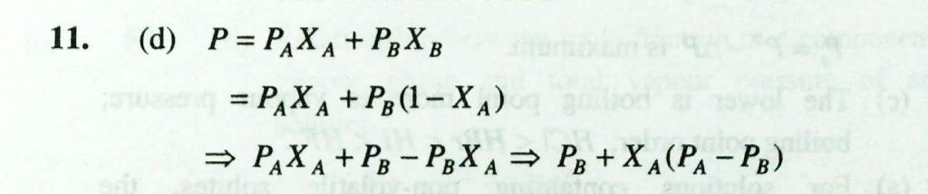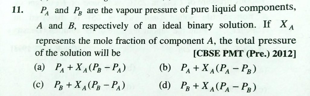 PA and PB are the vapour pressure of pure liquid components A and B respectively of an ideal binary solution. If xA represents the mole fraction of component A, the total pressure of the solution will be : PA and PB are the vapour pressure of pure liquid components A and B respectively of an ideal binary solution. If xA represents the mole fraction of component A the total pressure of the solution will be : December 12, 2020 Category: Uncategorised (JEE Advanced Physics by BM Sharma + GMP Solutions) , Facebook Messenger WhatsApp Share this:TwitterFacebook Related