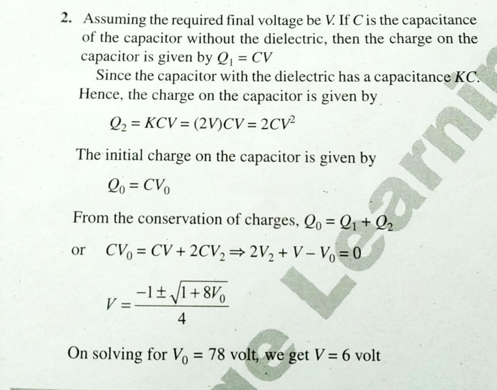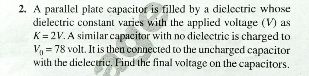 A parallel plate capacitor is filled by a dielectric whose dielectric constant varies with the applies voltage (V) as K = 2 V. A similar capacitor with no dielectric is charged to V0=78 volt.It is then connected to the uncharged capacitor with the dielectric.Find the final voltage on the capacitors
