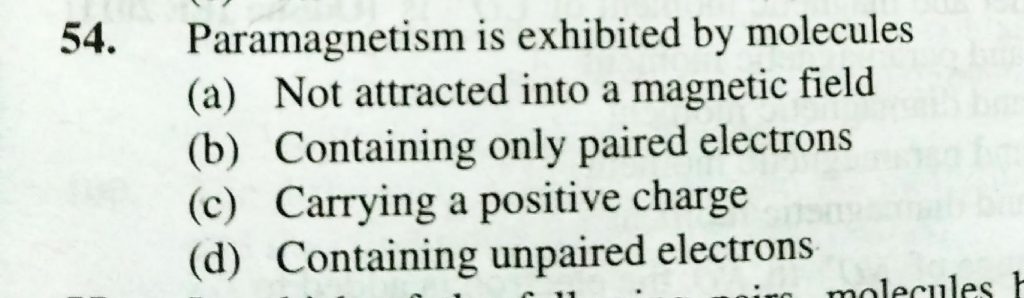 Paramagnetism is exhibited by molecules (a) Not attracted into magnetic field (b0 Containing only paired electrons (c) carrying a positive charge (d) containing unpaired electrons Paramagnetism is exhibited by molecules (a) Not attracted into magnetic field (b0 Containing only paired electrons (c) carrying a positive charge (d) containing unpaired electrons December 8, 2020 Category: Uncategorised (JEE Advanced Physics by BM Sharma + GMP Solutions) , Facebook Messenger WhatsApp Share this:TwitterFacebook Related
