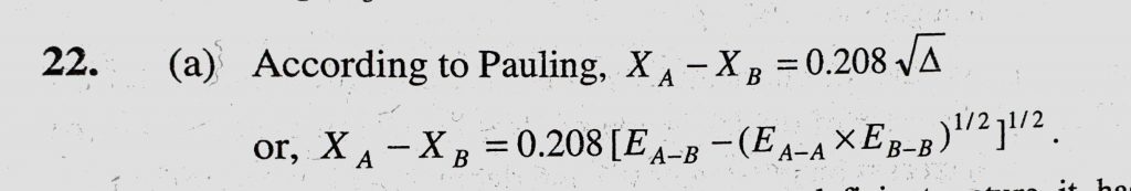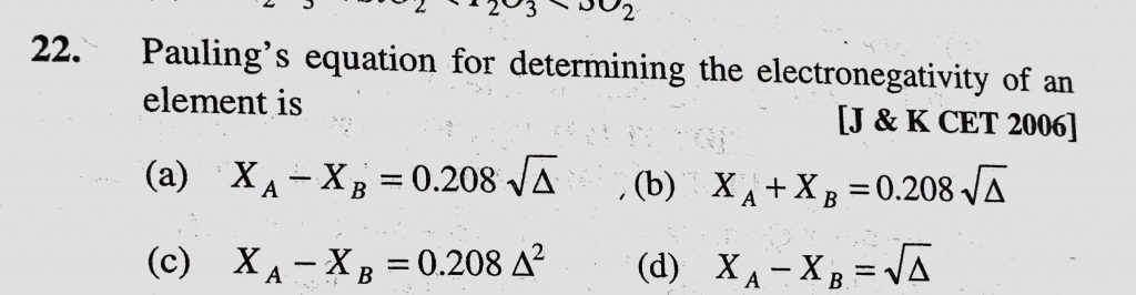 Pauling’s equation for determining the electronegativity of an element is XA – XB = 0.208 root delta (b) XA + XB = 0.208 root delta Pauling's equation for determining the electronegativity of an element is XA - XB = 0.208 root delta (b) XA + XB = 0.208 root delta November 10, 2020 Category: Uncategorised (JEE Advanced Physics by BM Sharma + GMP Solutions) , Facebook Messenger WhatsApp Share this:TwitterFacebook Related