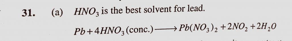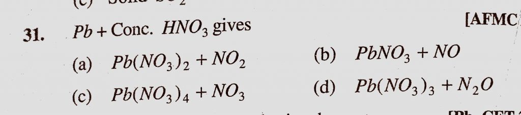 Pb + Conc. HNO3 gives (a) Pb(NO3)2 + NO2 (b) PbNO3 + NO (c) Pb(NO3)4 + NO3 (d) Pb(N)3)3 + N2O Pb + Conc. HNO3 gives (a) Pb(NO3)2 + NO2 (b) PbNO3 + NO (c) Pb(NO3)4 + NO3 (d) Pb(N)3)3 + N2O November 17, 2020 Category: Uncategorised (JEE Advanced Physics by BM Sharma + GMP Solutions) , Facebook Messenger WhatsApp Share this:TwitterFacebook Related
