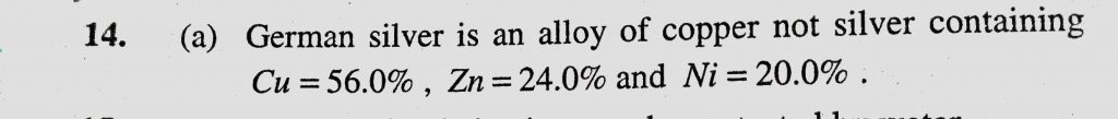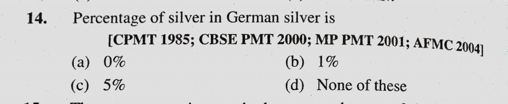 Percentage of silver in German silver is (a) 0% (b) 1% (c) 5% (d) None of these Percentage of silver in German silver is (a) 0% (b) 1% (c) 5% (d) None of these December 1, 2020 Category: Uncategorised (JEE Advanced Physics by BM Sharma + GMP Solutions) , Facebook Messenger WhatsApp Share this:TwitterFacebook Related
