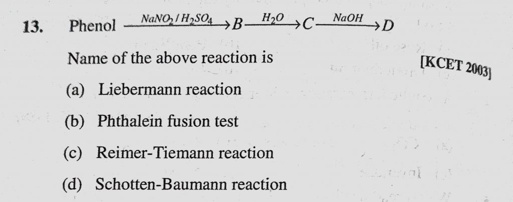 Phenol gives B gives C gives D Name of the above reaction is (a) Liebermann reaction (b) Phthalein fusion test (c) Reimer-Tiemann reaction (d) Schotten – Baumann reaction Phenol gives B gives C gives D Name of the above reaction is (a) Liebermann reaction (b) Phthalein fusion test (c) Reimer-Tiemann reaction (d) Schotten - Baumann reaction February 11, 2021 Category: Uncategorised (JEE Advanced Physics by BM Sharma + GMP Solutions) , Facebook Messenger WhatsApp Share this:TwitterFacebook Related
