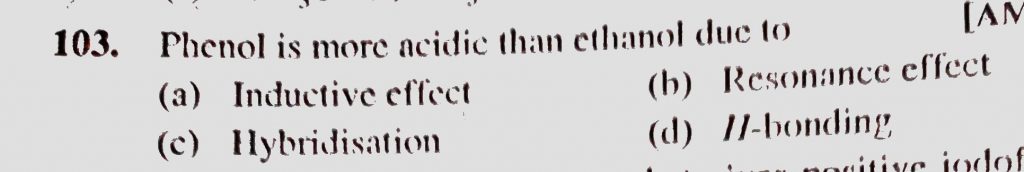 Phenol is more acidic than ethanol due to (a) Inductive effect (b) resonance effect (c) Hybridisation (d) H-bonding Phenol is more acidic than ethanol due to (a) Inductive effect (b) resonance effect (c) Hybridisation (d) H-bonding February 13, 2021 Category: Uncategorised (JEE Advanced Physics by BM Sharma + GMP Solutions) , Facebook Messenger WhatsApp Share this:TwitterFacebook Related