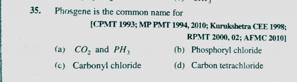 Phosgene is the common name for (a) CO2 and PH3 (b) Phosphoryl chloride (c) Carbonyl chloride (d) Carbon tetrachloride Phosgene is the common name for (a) CO2 and PH3 (b) Phosphoryl chloride (c) Carbonyl chloride (d) Carbon tetrachloride February 8, 2021 Category: Uncategorised (JEE Advanced Physics by BM Sharma + GMP Solutions) , Facebook Messenger WhatsApp Share this:TwitterFacebook Related