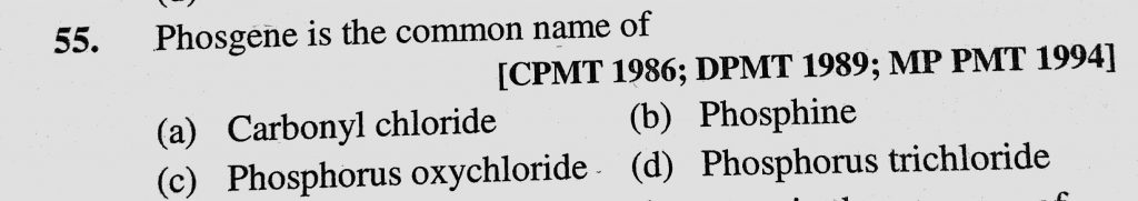 Phosgene is the common name of (a) Carbonyl chloride (b) Phosphine (c) Phosphorus oxychloride (d) Phosphorus trichloride Phosgene is the common name of (a) Carbonyl chloride (b) Phosphine (c) Phosphorus oxychloride (d) Phosphorus trichloride November 24, 2020 Category: Uncategorised (JEE Advanced Physics by BM Sharma + GMP Solutions) , Facebook Messenger WhatsApp Share this:TwitterFacebook Related