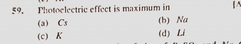 Photoelectric effect is maximum in (a) Cs (b) Na (c) K (d) Li Photoelectric effect is maximum in (a) Cs (b) Na (c) K (d) Li November 13, 2020 Category: Uncategorised (JEE Advanced Physics by BM Sharma + GMP Solutions) , Facebook Messenger WhatsApp Share this:TwitterFacebook Related