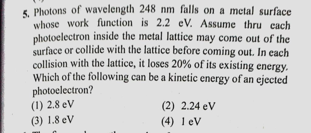 Photons of wavelength 248 nm falls on a metal surface whose work function is 2.2 eV. Assume thru each photoelectron inside the metal lattice may come out of the surface or collide Photons of wavelength 248 nm falls on a metal surface whose work function is 2.2 eV. Assume thru each photoelectron inside the metal lattice may come out of the surface or collide October 14, 2020 Category: Uncategorised (JEE Advanced Physics by BM Sharma + GMP Solutions) , Facebook Messenger WhatsApp Share this:TwitterFacebook Related