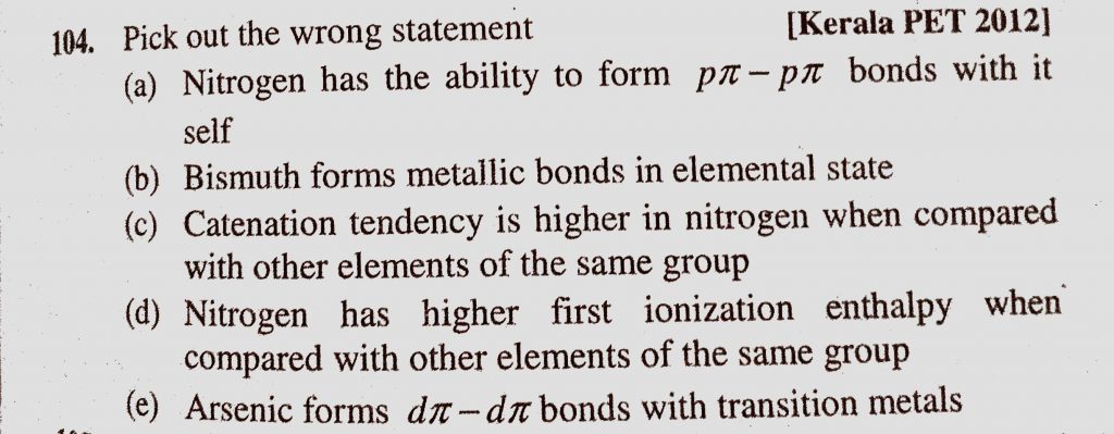 Pick out the wrong statement (a) Nitrogen has the ability to form p pie – p pie bonds with itself (b) Bismuth forms metallic bonds in elemental state Pick out the wrong statement (a) Nitrogen has the ability to form p pie - p pie bonds with itself (b) Bismuth forms metallic bonds in elemental state November 22, 2020 Category: Uncategorised (JEE Advanced Physics by BM Sharma + GMP Solutions) , Facebook Messenger WhatsApp Share this:TwitterFacebook Related