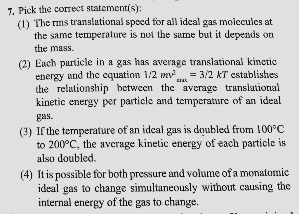 Pick the correct statement(s) : (1) The rms translational speed for all ideal gas molecules at the same temperature is not the same but it depends on the mass. (2) Each particle in a gas Pick the correct statement(s) : (1) The rms translational speed for all ideal gas molecules at the same temperature is not the same but it depends on the mass. (2) Each particle in a gas October 28, 2020 Category: Uncategorised (JEE Advanced Physics by BM Sharma + GMP Solutions) , Facebook Messenger WhatsApp Share this:TwitterFacebook Related