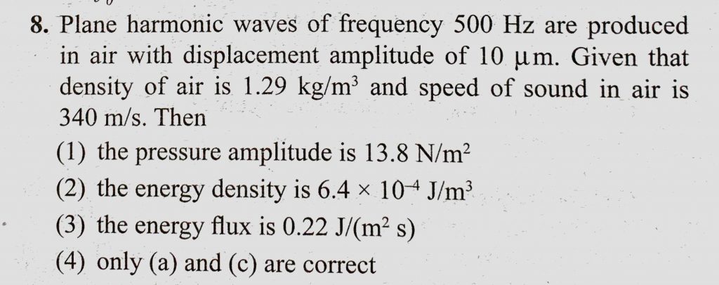 Plane harmonic waves of frequency 500 Hz are produced in air with displacement amplitude of 10 mu m. Given that density of air is 1.29 kg/m^3 and speed of sound in air is Plane harmonic waves of frequency 500 Hz are produced in air with displacement amplitude of 10 mu m. Given that density of air is 1.29 kg/m^3 and speed of sound in air is November 8, 2020 Category: Uncategorised (JEE Advanced Physics by BM Sharma + GMP Solutions) , Facebook Messenger WhatsApp Share this:TwitterFacebook Related