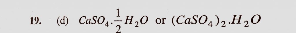 Plaster of Paris is (a) CaSO4.2H2O (b) CaSO4.3H2O (c) CaSO4.3H2O (d) CaSO4. 1/2 H2O Plaster of Paris is (a) CaSO4.2H2O (b) CaSO4.3H2O (c) CaSO4.3H2O (d) CaSO4. 1/2 H2O November 15, 2020 Category: Uncategorised (JEE Advanced Physics by BM Sharma + GMP Solutions) , Facebook Messenger WhatsApp Share this:TwitterFacebook Related