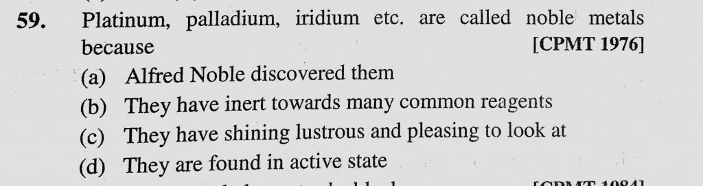 Platinum, palladium, iridium etc. are called noble metals because (a) Alfred Noble discovered them (b) They have inert towards many common reagents iridium etc. are called noble metals because (a) Alfred Noble discovered them (b) They have inert towards many common reagents palladium Platinum November 29, 2020 Category: Uncategorised (JEE Advanced Physics by BM Sharma + GMP Solutions) , Facebook Messenger WhatsApp Share this:TwitterFacebook Related