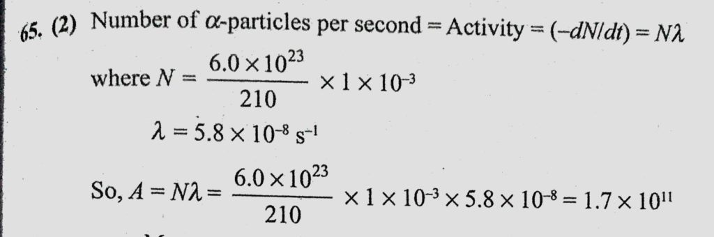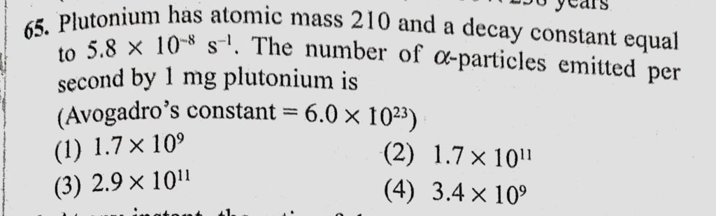 Plutonium has atomic mass 210 and a decay constant equal to 5.8 * 10^8 s^-1. The number of alpha particles emitted per second by 1 mg plutonium is Plutonium has atomic mass 210 and a decay constant equal to 5.8 * 10^8 s^-1. The number of alpha particles emitted per second by 1 mg plutonium is October 18, 2020 Category: Uncategorised (JEE Advanced Physics by BM Sharma + GMP Solutions) , Facebook Messenger WhatsApp Share this:TwitterFacebook Related