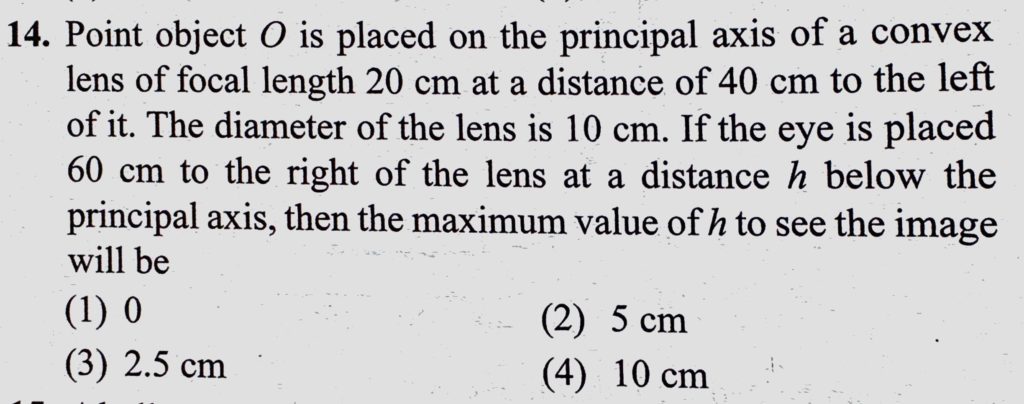 Point object O is placed on the principal axis of a convex lens of focal length 20 cm at a distance of 40 cm to the left of it. The diameter of the lens is 10 cm. If the eye is placed 60 cm Point object O is placed on the principal axis of a convex lens of focal length 20 cm at a distance of 40 cm to the left of it. The diameter of the lens is 10 cm. If the eye is placed 60 cm October 8, 2020 Category: Uncategorised (JEE Advanced Physics by BM Sharma + GMP Solutions) , Facebook Messenger WhatsApp Share this:TwitterFacebook Related