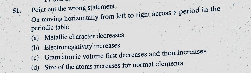 Point out the wrong statement On moving horizontally from left to right across a period in the periodic table Point out the wrong statement On moving horizontally from left to right across a period in the periodic table November 9, 2020 Category: Uncategorised (JEE Advanced Physics by BM Sharma + GMP Solutions) , Facebook Messenger WhatsApp Share this:TwitterFacebook Related