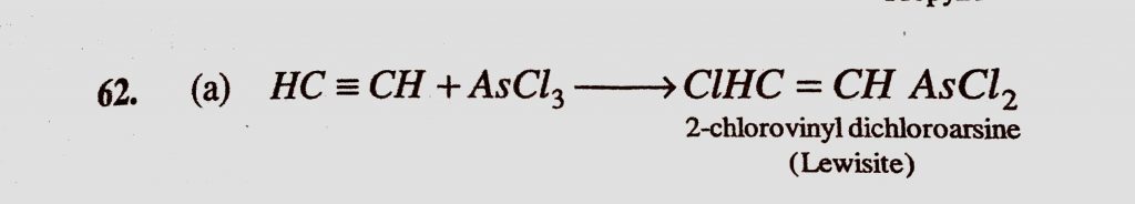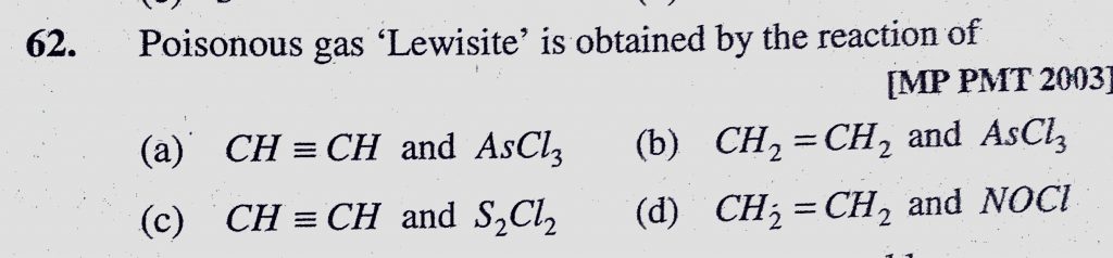 Poisonous gas ‘Lewisite’ is obtained by the reaction of CH≡CH and AsCl3 CH2=CH2 and AsCl3 CH≡CH and S2Cl2 CH2=CH2 and NOCl Poisonous gas 'Lewisite' is obtained by the reaction of CH≡CH and AsCl3 CH2=CH2 and AsCl3 CH≡CH and S2Cl2 CH2=CH2 and NOCl December 14, 2020 Category: Uncategorised (JEE Advanced Physics by BM Sharma + GMP Solutions) , Facebook Messenger WhatsApp Share this:TwitterFacebook Related