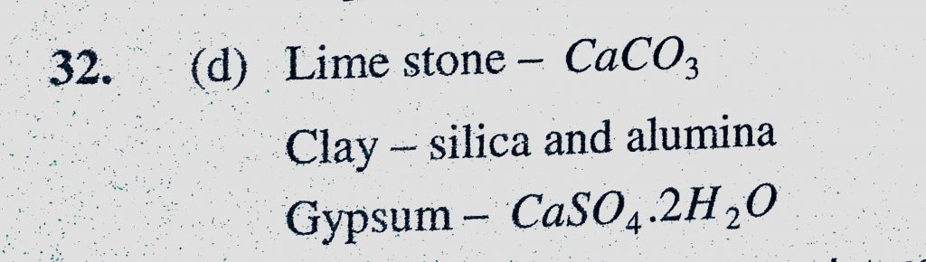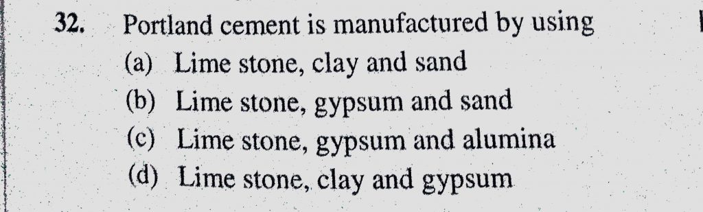Portland cement is manufactured by using (a) Lime stone, clay and sand (b) Lime stone, gypsum and sand (c) Lime stone, gypsum and alumina clay and sand (b) Lime stone gypsum and alumina gypsum and sand (c) Lime stone Portland cement is manufactured by using (a) Lime stone November 15, 2020 Category: Uncategorised (JEE Advanced Physics by BM Sharma + GMP Solutions) , Facebook Messenger WhatsApp Share this:TwitterFacebook Related