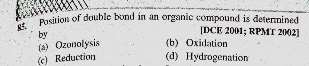 Position of double bond in an organic compound is determined by (a) Ozonolysis (b) Oxidation (c) Reduction (d) Hydrogenation Position of double bond in an organic compound is determined by (a) Ozonolysis (b) Oxidation (c) Reduction (d) Hydrogenation December 13, 2020 Category: Uncategorised (JEE Advanced Physics by BM Sharma + GMP Solutions) , Facebook Messenger WhatsApp Share this:TwitterFacebook Related