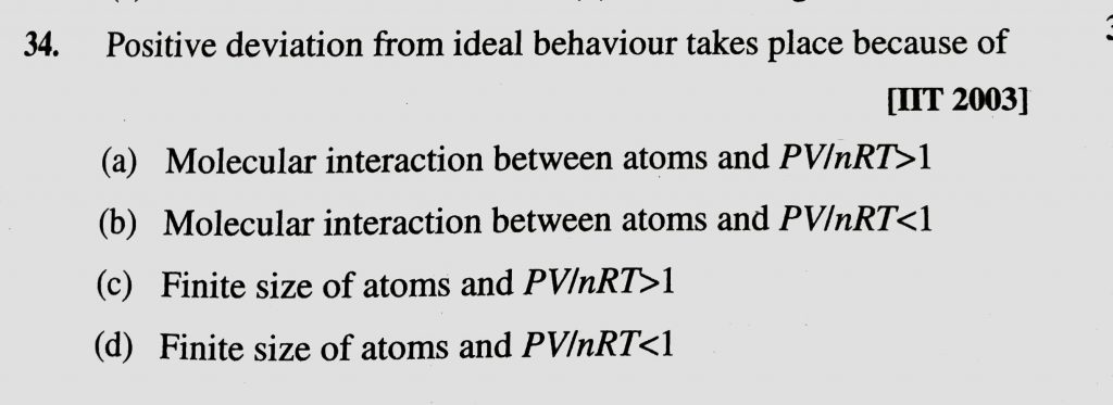Positive deviation from ideal behaviour takes place because (a) Molecular interaction between atoms and PV/nRT >1 (b) Molecular interaction between atoms and PV/nRT 1 (d) Finite size of atoms and PV/nRT < 1 The root mean square velocity of an ideal gas at constant pressure varies with density (d) as (a) d^2 (b) d (c) root d (d) 1/root d February 12, 2021 Category: Uncategorised (JEE Advanced Physics by BM Sharma + GMP Solutions) , Facebook Messenger WhatsApp Share this:TwitterFacebook Related