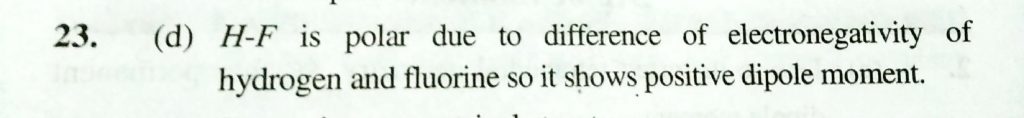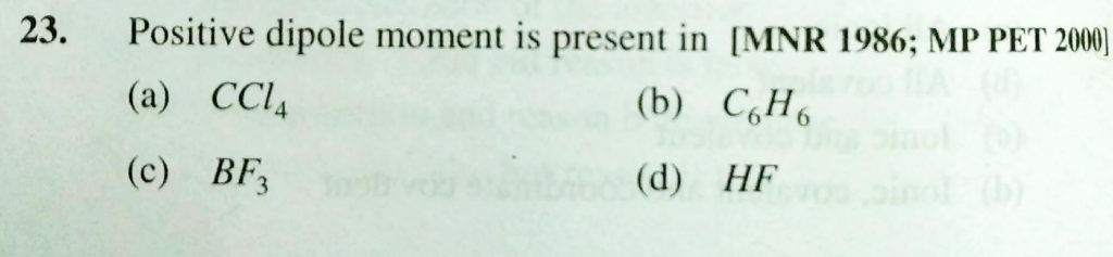 Positive dipole moment is present in (a) CCl4 (b) C6H6 (c) BF3 (d) HF Positive dipole moment is present in (a) CCl4 (b) C6H6 (c) BF3 (d) HF December 2, 2020 Category: Uncategorised (JEE Advanced Physics by BM Sharma + GMP Solutions) , Facebook Messenger WhatsApp Share this:TwitterFacebook Related