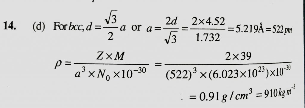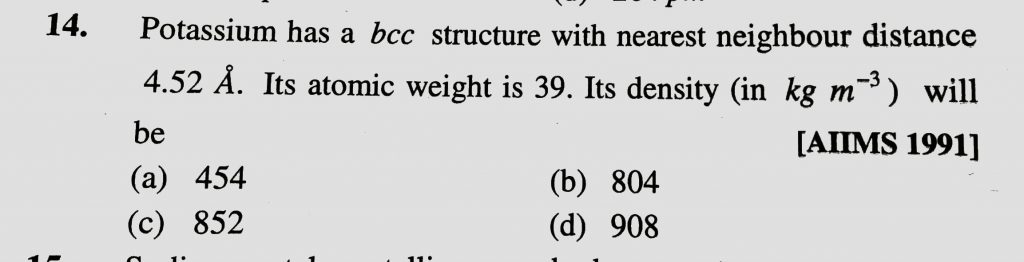 Potassium has a bcc structure with nearest neighbour distance 4.52 A. Its atomic weight is 39. Its density ( in kg/m^3 ) will be Potassium has a bcc structure with nearest neighbour distance 4.52 A. Its atomic weight is 39. Its density ( in kg/m^3 ) will be December 16, 2020 Category: Uncategorised (JEE Advanced Physics by BM Sharma + GMP Solutions) , Facebook Messenger WhatsApp Share this:TwitterFacebook Related