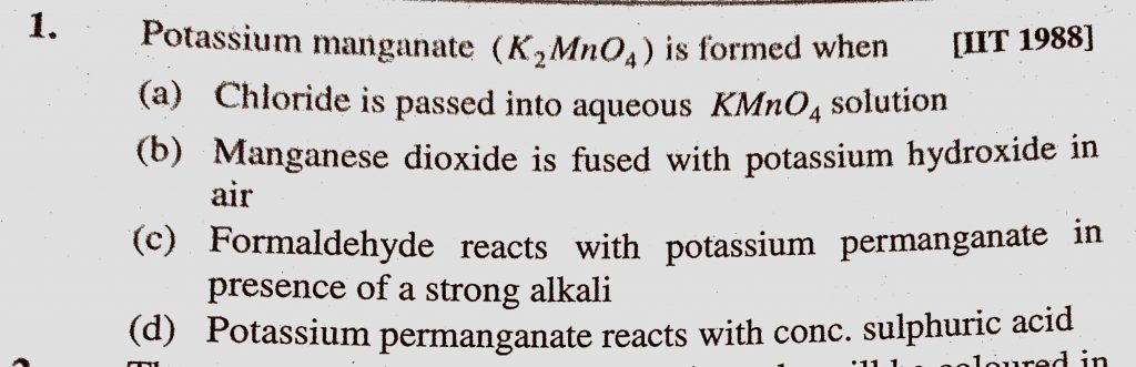Potassium manganate (K2MnO4) is formed when (a) Chloride is passed into aqueous KMnO4 solution (b) Manganese dioxide is fused with potassium hydroxide in air Potassium manganate (K2MnO4) is formed when (a) Chloride is passed into aqueous KMnO4 solution (b) Manganese dioxide is fused with potassium hydroxide in air December 6, 2020 Category: Uncategorised (JEE Advanced Physics by BM Sharma + GMP Solutions) , Facebook Messenger WhatsApp Share this:TwitterFacebook Related