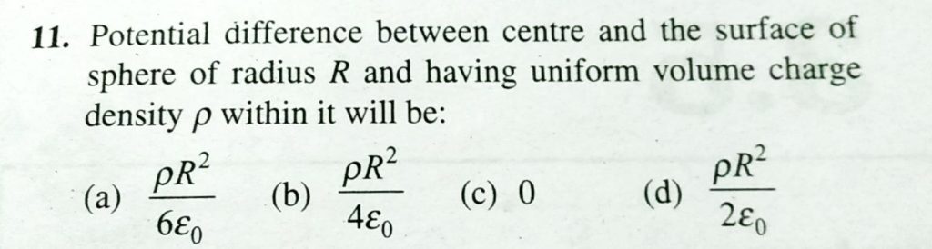 Potential difference between centre and the surface of sphere of radius R having uniform volume charge density p with in it will be Potential difference between centre and the surface of sphere of radius R having uniform volume charge density p with in it will be September 18, 2020 Category: Uncategorised (JEE Advanced Physics by BM Sharma + GMP Solutions) , Facebook Messenger WhatsApp Share this:TwitterFacebook Related