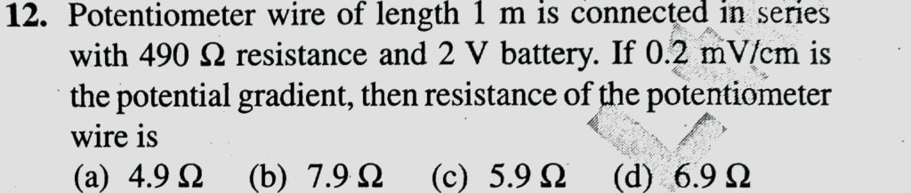 Potentiometer wire of length 1 m is connected in series with 490 ohm resistance and 2 V battery. If 0.2 mV/cm is the potential gradient, then resistance of the potentiometer wire is Potentiometer wire of length 1 m is connected in series with 490 ohm resistance and 2 V battery. If 0.2 mV/cm is the potential gradient then resistance of the potentiometer wire is September 20, 2020 Category: Uncategorised (JEE Advanced Physics by BM Sharma + GMP Solutions) , Facebook Messenger WhatsApp Share this:TwitterFacebook Related