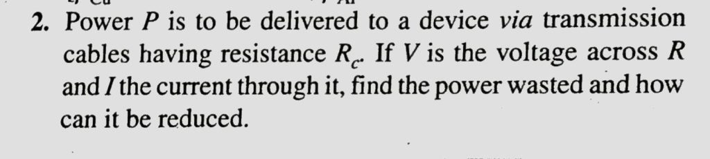 Power P is to be delivered to a device via transmission cables having resistance Rc. If V is the voltage across R and I the current through it , find the power wasted and how can it be reduced. find the power wasted and how can it be reduced. Power P is to be delivered to a device via transmission cables having resistance Rc. If V is the voltage across R and I the current through it September 21, 2020 Category: Uncategorised (JEE Advanced Physics by BM Sharma + GMP Solutions) , Facebook Messenger WhatsApp Share this:TwitterFacebook Related