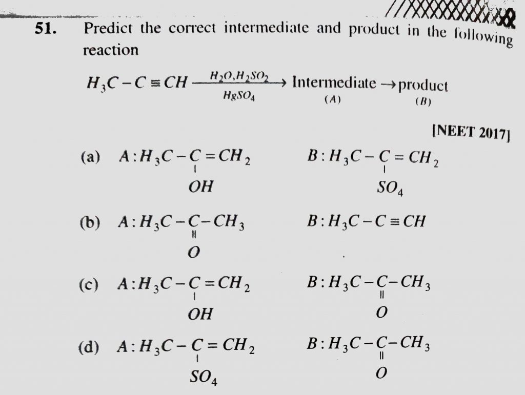 Predict the correct intermediate and product in the following reaction: H3C−C≡Ch−→−−−−−HgSO4H2O,H2SO4Intermediate→Product H2SO4Intermediate→Product Predict the correct intermediate and product in the following reaction: H3C−C≡Ch−→−−−−−HgSO4H2O December 13, 2020 Category: Uncategorised (JEE Advanced Physics by BM Sharma + GMP Solutions) , Facebook Messenger WhatsApp Share this:TwitterFacebook Related