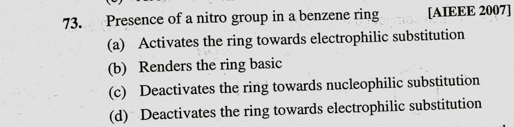 Presence of a nitro group in a benzene ring (a) Activates the ring towards electophilic substitution (b) Renders the ring basic Presence of a nitro group in a benzene ring (a) Activates the ring towards electophilic substitution (b) Renders the ring basic December 15, 2020 Category: Uncategorised (JEE Advanced Physics by BM Sharma + GMP Solutions) , Facebook Messenger WhatsApp Share this:TwitterFacebook Related