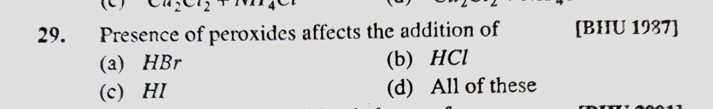 Presence of peroxides affects the addition of (a) HBr (b) HCl (c) HI (d) All of these Presence of peroxides affects the addition of (a) HBr (b) HCl (c) HI (d) All of these December 13, 2020 Category: Uncategorised (JEE Advanced Physics by BM Sharma + GMP Solutions) , Facebook Messenger WhatsApp Share this:TwitterFacebook Related