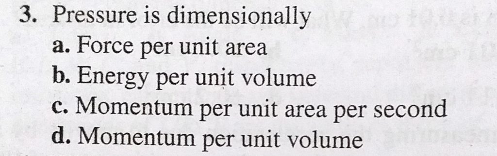 Pressure is dimensionally a. Force per unit area b. Energy per unit volume c. Momentum per unit area per second d. Momentum per unit volume. Pressure is dimensionally a. Force per unit area b. Energy per unit volume c. Momentum per unit area per second d. Momentum per unit volume. September 15, 2020 Category: Uncategorised (JEE Advanced Physics by BM Sharma + GMP Solutions) , Facebook Messenger WhatsApp Share this:TwitterFacebook Related
