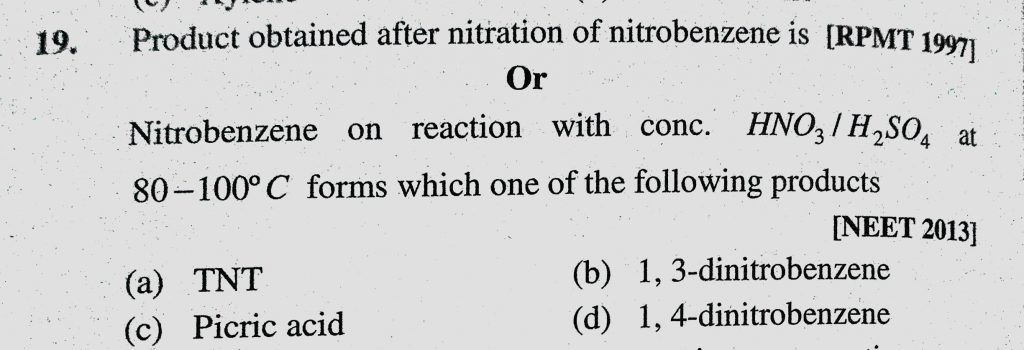 Product obtained after nitration of nitrobenzene is Or Nitrobenzene on reaction with conc. HNO3/H2SO4 at 80-100 C forms which one of the following products Product obtained after nitration of nitrobenzene is Or Nitrobenzene on reaction with conc. HNO3/H2SO4 at 80-100 C forms which one of the following products December 15, 2020 Category: Uncategorised (JEE Advanced Physics by BM Sharma + GMP Solutions) , Facebook Messenger WhatsApp Share this:TwitterFacebook Related