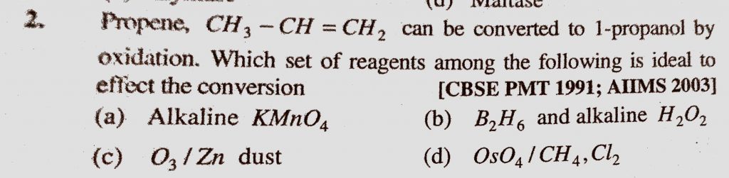 Propene, CH3-CH=CH2 can be converted to 1-propanol by oxidation. Which set of reagents among the following is ideal to effect the conversion CH3-CH=CH2 can be converted to 1-propanol by oxidation. Which set of reagents among the following is ideal to effect the conversion Propene February 10, 2021 Category: Uncategorised (JEE Advanced Physics by BM Sharma + GMP Solutions) , Facebook Messenger WhatsApp Share this:TwitterFacebook Related