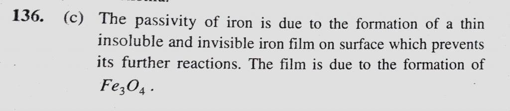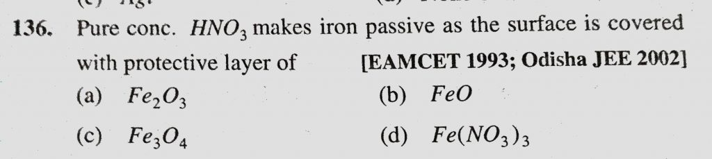 Pure conc. HNO3 makes iron passive as the surface is covered with protective layer of (a) Fe2O3 (b) FeO (c) Fe3O4 (d) Fe(N)3)3 Pure conc. HNO3 makes iron passive as the surface is covered with protective layer of (a) Fe2O3 (b) FeO (c) Fe3O4 (d) Fe(N)3)3 December 1, 2020 Category: Uncategorised (JEE Advanced Physics by BM Sharma + GMP Solutions) , Facebook Messenger WhatsApp Share this:TwitterFacebook Related