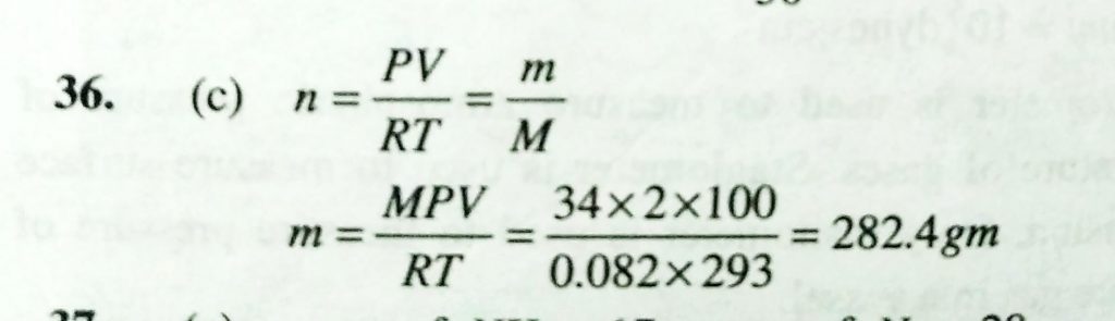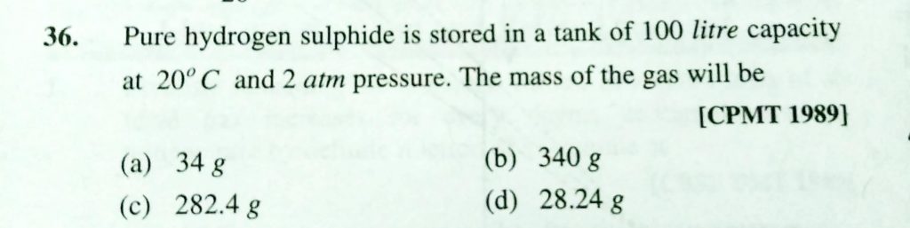 Pure hydrogen sulphide is tored in a tank of 100 litre capacity at 20 degree C and 2 atm pressure. The mass of the gas will be (a) 34 g (b) 340 g (c) 282.4 g (d) 28.24 g Pure hydrogen sulphide is tored in a tank of 100 litre capacity at 20 degree C and 2 atm pressure. The mass of the gas will be (a) 34 g (b) 340 g (c) 282.4 g (d) 28.24 g February 10, 2021 Category: Uncategorised (JEE Advanced Physics by BM Sharma + GMP Solutions) , Facebook Messenger WhatsApp Share this:TwitterFacebook Related