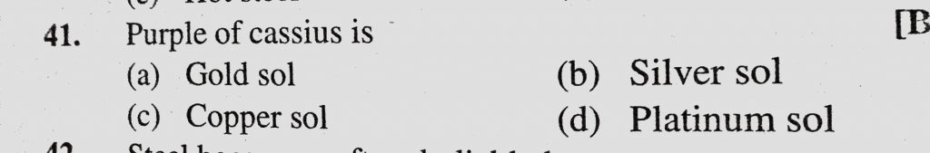 Purple of cassius is (a) Gold sol (b) Silver sol (c) Copper sol (d) Platinum sol Purple of cassius is (a) Gold sol (b) Silver sol (c) Copper sol (d) Platinum sol December 1, 2020 Category: Uncategorised (JEE Advanced Physics by BM Sharma + GMP Solutions) , Facebook Messenger WhatsApp Share this:TwitterFacebook Related