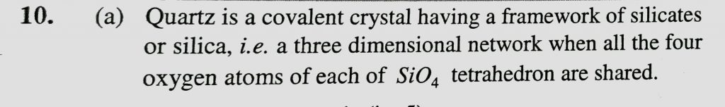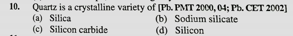 Quartz is a crystalline variety of (a) Silica (b) Sodium silicate (c) Silicon carbide (d) Silicon Quartz is a crystalline variety of (a) Silica (b) Sodium silicate (c) Silicon carbide (d) Silicon February 8, 2021 Category: Uncategorised (JEE Advanced Physics by BM Sharma + GMP Solutions) , Facebook Messenger WhatsApp Share this:TwitterFacebook Related