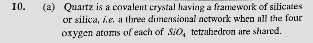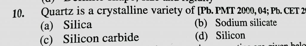 Quartz is a crystalline variety of (a) Silica (b) Sodium silicate (c) Silicon carbide (d) Silicon Quartz is a crystalline variety of (a) Silica (b) Sodium silicate (c) Silicon carbide (d) Silicon December 16, 2020 Category: Uncategorised (JEE Advanced Physics by BM Sharma + GMP Solutions) , Facebook Messenger WhatsApp Share this:TwitterFacebook Related